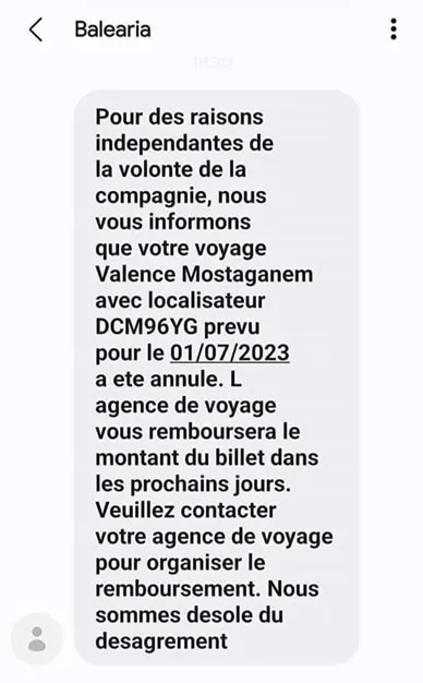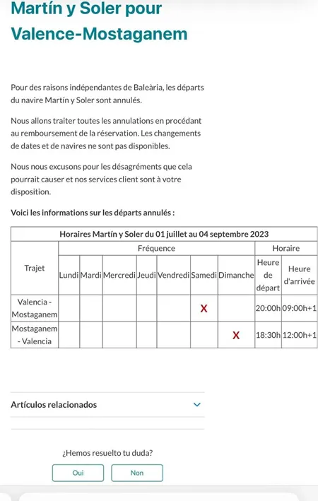La compagnie maritime espagnole a tenu à informer aimablement ses passagers de l'annulation des traversées prévues sur sa ligne Valence-Mostaganem. Dans un communiqué diffusé sur son site de réservation, la compagnie annonce avec une pointe de regret : « En raison de circonstances indépendantes de la volonté de Baleària, les départs du navire Martín y Soler sont malheureusement annulés ».