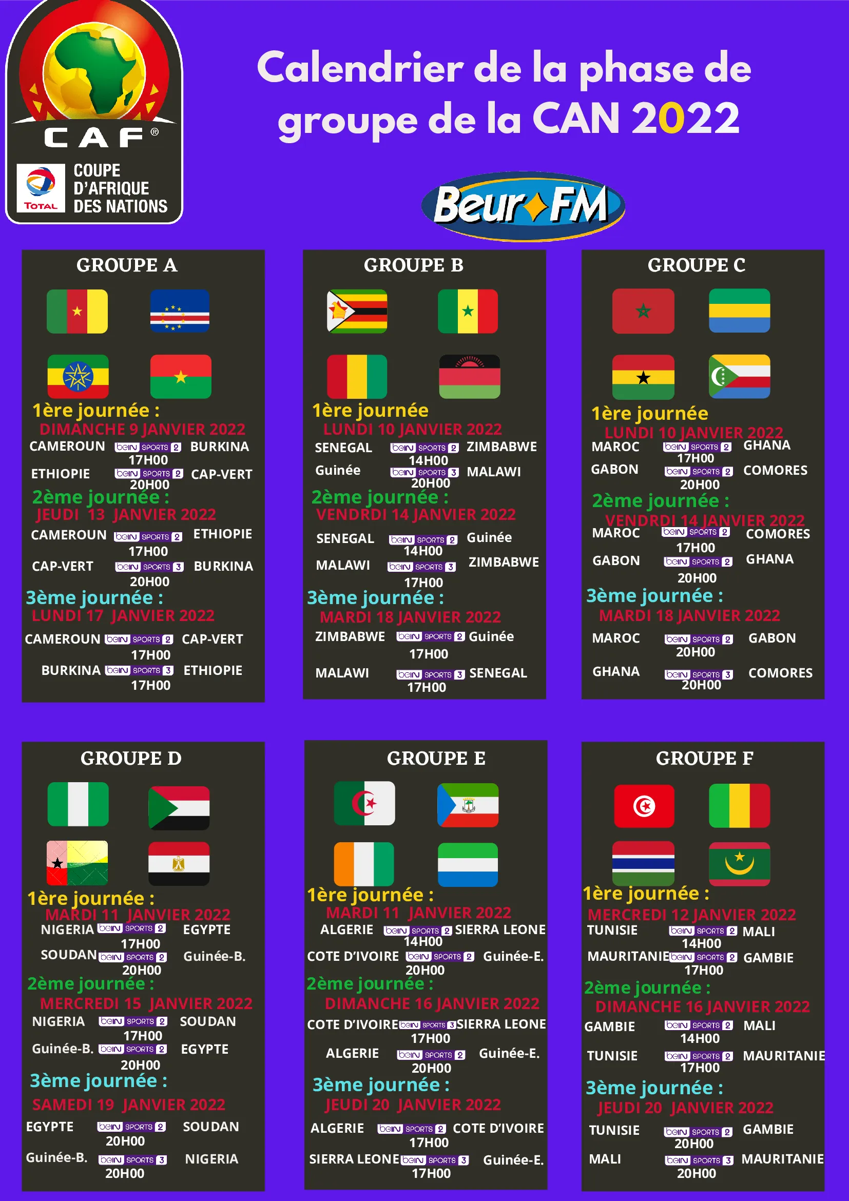 - 17h : Burkina Faso – Ethiopie (Bein Sports 3)