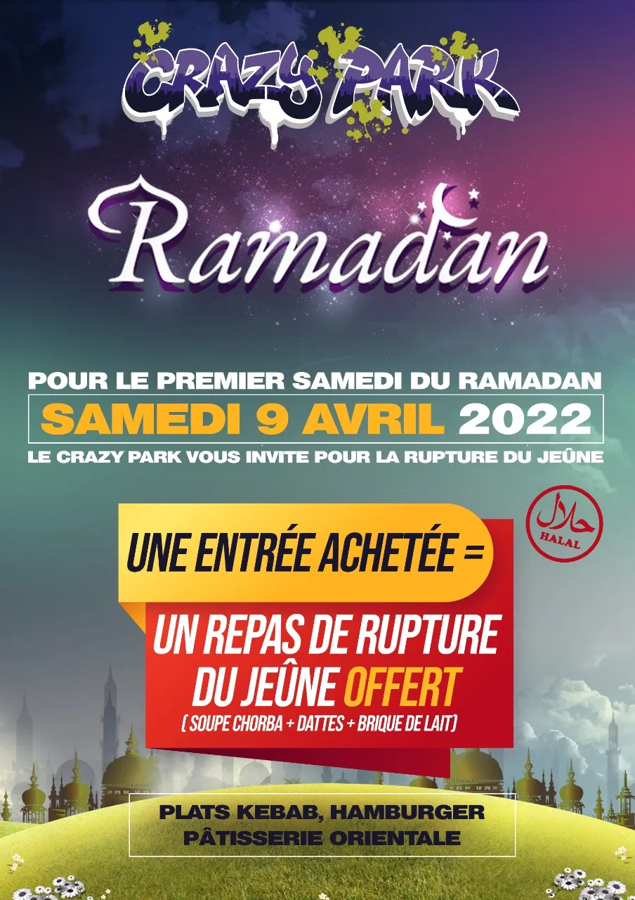 Samedi 9 avril, le Crazy Park propose une soirée spéciale ramadan ! Pour chaque entrée achetée, un repas de rupture du jeune est offert.