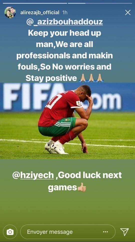 "Aziz Bouhaddouz. Je ne te connais pas personnellement mais dans la vie, parfois on gagne, parfois on perd. Ne laisse pas ce but marqué contre ton camp t’abattre. Nous sommes tous des sportifs professionnels et cela fait partie du football. Je suis si heureux et fier de mon équipe et de mon pays, mais je voulais te souhaiter aussi tout le meilleur dans ta carrière. Reza."